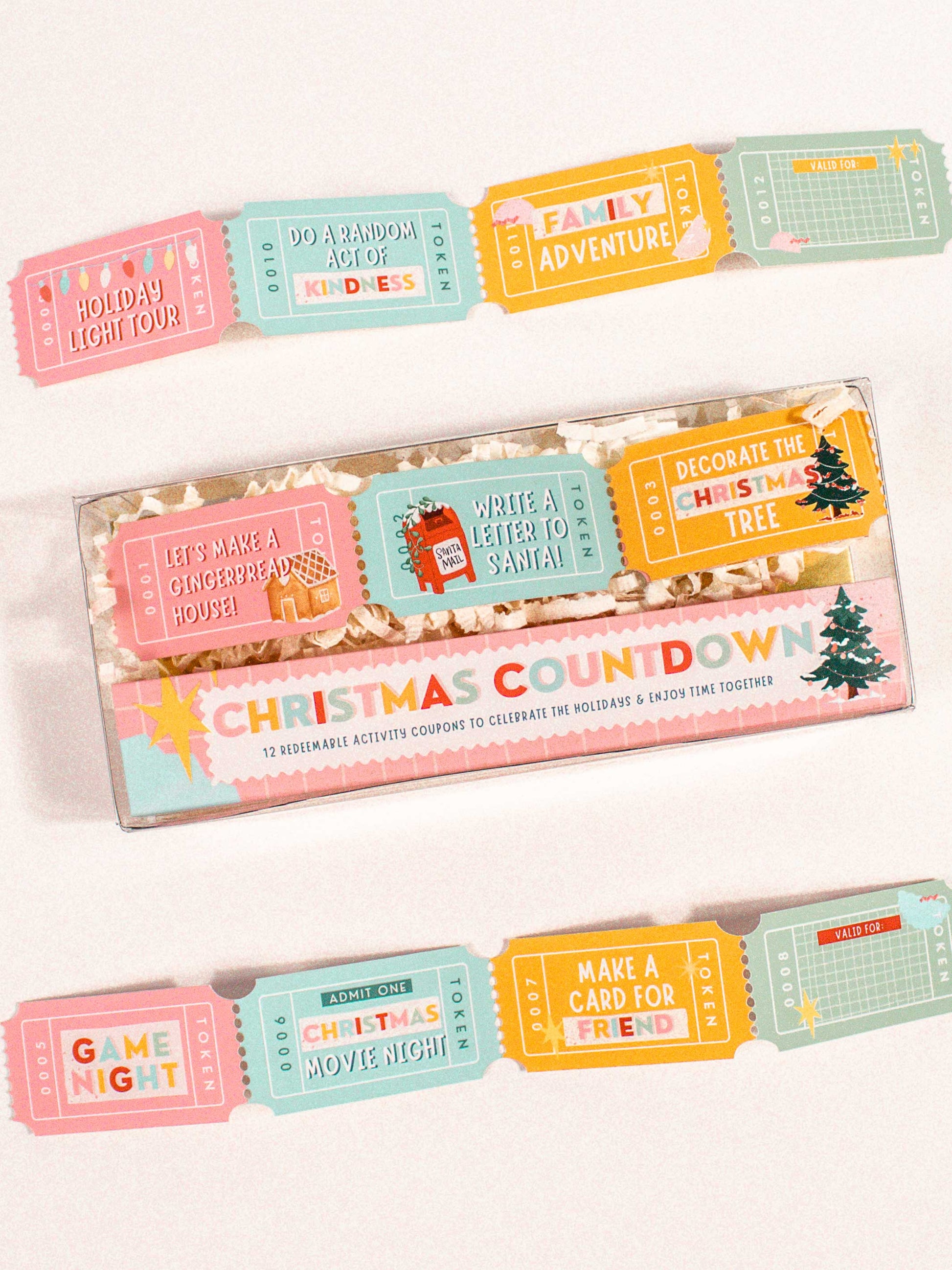 • Let's make a gingerbread house!, Write a letter to Santa!, Decorate the Christmas tree, Hot cocoa & marshmallows, Game night, Christmas movie night, Make a card for a friend, Holiday light tour, Do a random act of kindness, Family adventure, + 2 blank coupons.
